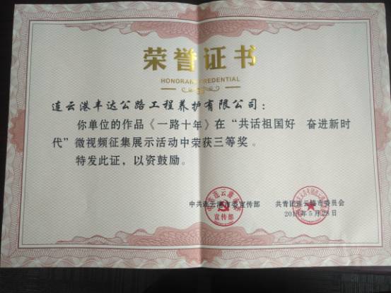 豐達(dá)公司拍攝的微視頻《一路十年》在市委宣傳部、團(tuán)市委共同主辦的“共話祖國(guó)好 奮進(jìn)新時(shí)代”微視頻征集活動(dòng)中榮獲三等獎(jiǎng)。