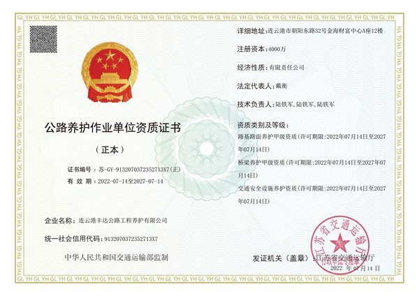 本次新取得的三項資質(zhì)證書,為豐達公司繼續(xù)立足公路養(yǎng)護市場奠定基礎,也意味著可以拓展更加廣闊的公路養(yǎng)護市場領域。