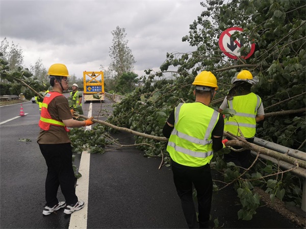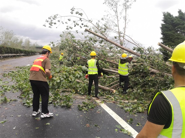 20日中午12時,寧連高速公路南京方向K1716處受龍卷風(fēng)影響,造成路面兩側(cè)樹木倒伏120余棵,倒伏樹木阻斷了雙向交通,使交通受到影響。公司迅速啟動應(yīng)急搶險快速反應(yīng)機制,搶險人員爭分奪秒利用油鋸對倒伏路樹分段鋸斷,對倒伏樹木進行快速處理,經(jīng)過20分鐘的戰(zhàn)斗,先打通一條車道讓過往車輛先通行,后經(jīng)過3個小時的緊張工作,將路面上的倒伏樹木全部清理完成,及時地消除了道路安全隱患,保障了道路行車安全。