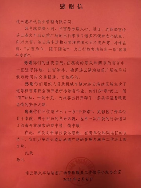 趙潔對市城管局、市廣場辦一直以來關(guān)心、支持表示感謝,同時他表示一面錦旗,是一份榮譽(yù),更是一份責(zé)任。這面錦旗既是對豐達(dá)公司工作的支持,同時也是對公司未來工作的鞭策。下一步,豐達(dá)公司將“錦”記于心,砥礪前行,以這次掃雪除冰工作為契機(jī),復(fù)盤推演查找不足,進(jìn)一步完善公司搶險工作流程,切實做好綜合客運(yùn)樞紐的服務(wù)保障、環(huán)境衛(wèi)生等工作,保障綜合客運(yùn)樞紐周邊道路的暢通及旅客的出行安全。