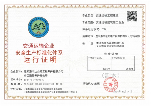 近日,豐達(dá)公司市區(qū)道路養(yǎng)護(hù)分公司順利通過江蘇省交通運輸協(xié)會認(rèn)定,被評為交通運輸企業(yè)安全生產(chǎn)標(biāo)準(zhǔn)化建設(shè)三級企業(yè)。