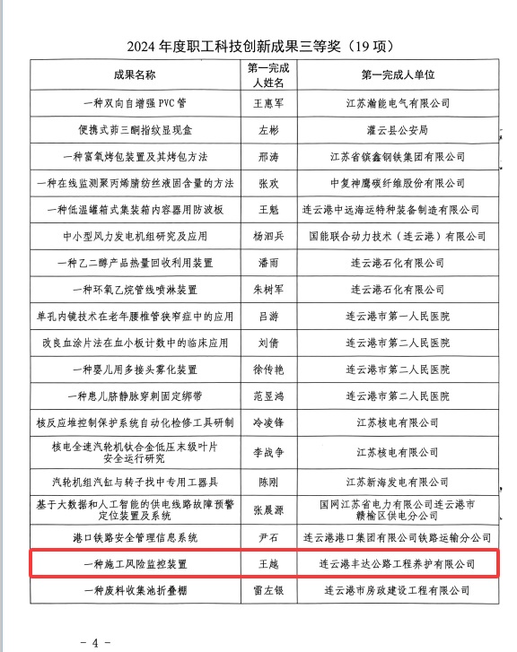 為全面落實習(xí)近平總書記關(guān)于科技創(chuàng)新的重要指示要求,連云港市總工會緊扣《新時代連云港產(chǎn)業(yè)工人隊伍建設(shè)改革實施方案》,在全市職工中征集科技創(chuàng)新成果和先進(jìn)操作法。經(jīng)個人申報、單位推薦、專家評審、媒體公示,認(rèn)定和表彰33項操作法為“2024年度連云港市職工科技創(chuàng)新成果”。公司職工王越的“一種施工風(fēng)險監(jiān)控裝置”獲市職工科技創(chuàng)新成果三等獎。