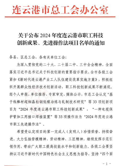 近日,在2024年度連云港市職工科技創(chuàng)新成果、先進(jìn)操作法作品評選中,豐達(dá)公司王越一項創(chuàng)新成果獲市職工科技創(chuàng)新成果三等獎。