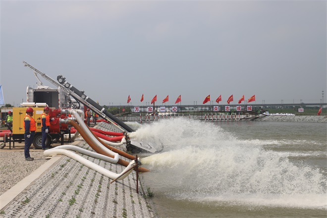 此次全市防汛搶險綜合演練設置臺風、城市特大暴雨、堤防險情、人員落水四個搶險救援背景并按照預警響應、隊伍集結、險情處置等環(huán)節(jié)有序開展,豐達公司主要演練科目為“城市特大暴雨——城市內澇處置”,利用垂直供排水搶險車、及字母式大流量排水車進行機泵排澇。