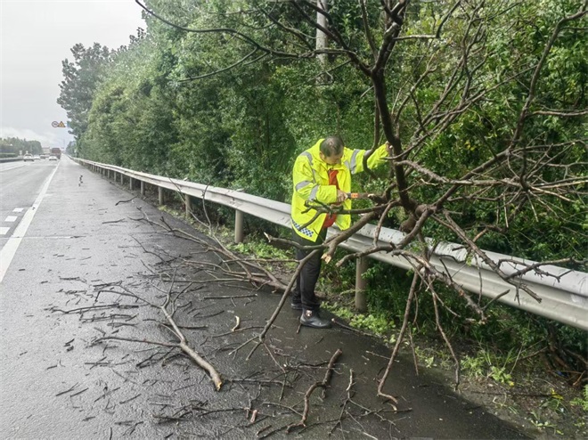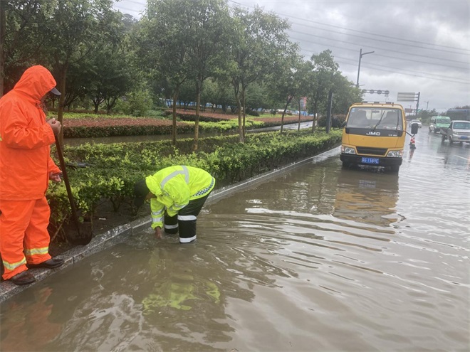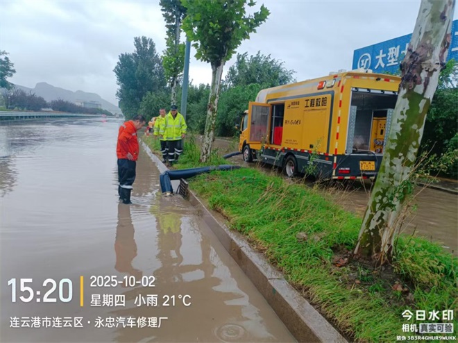 10月2日,大雨突降,公司迅速啟動防汛應(yīng)急預(yù)案,嚴(yán)格落實防汛措施,不分晝夜,連續(xù)對所轄高速公路、國省干線等重點路段及沿線設(shè)施開展隱患排查,確保道路安全暢通。針對G310港城大道、G228新光路等路段積水較多、路邊樹木倒伏等嚴(yán)重情況,公司立即組織橙色突擊隊員、道路養(yǎng)護(hù)人員及時清理疏通倒伏樹木、排水溝、雨水井,全力保障排水系統(tǒng)暢通與道路安全,累計出動道路養(yǎng)護(hù)人員 90人次、巡查車輛 12臺次,調(diào)配各類機械設(shè)備 14 臺次,清理倒伏樹木20余株。連云港綜合客運樞紐出站口突發(fā)雨水倒灌,公司立即組織應(yīng)急人員協(xié)助連云港站前廣場管理服務(wù)聯(lián)盟調(diào)動水泵排水并引導(dǎo)旅客安全出行。經(jīng)50分鐘緊急處置,積水全部排除,道路恢復(fù)暢通。